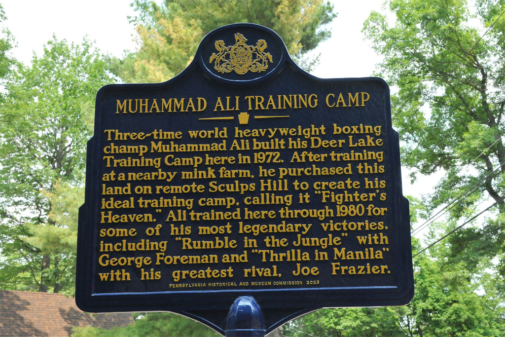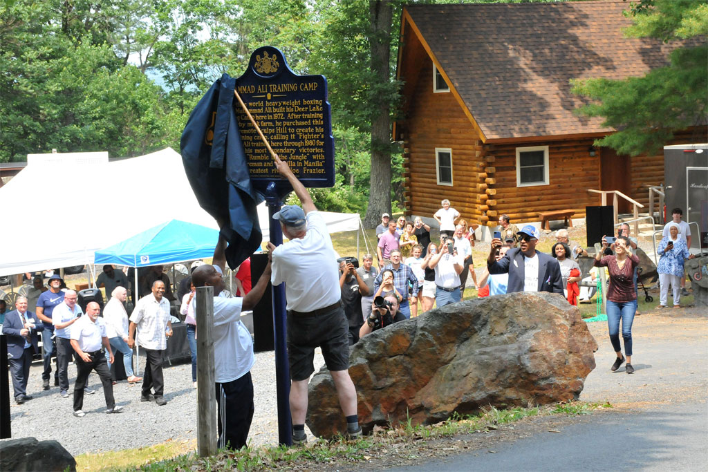 A Pennsylvania State Historical Marker was unveiled and dedicated at Fighter’s Heaven. The special dedication ceremony took place on June 3rd, the 7th anniversary of Ali’s passing. The event included appearances and speeches by Camp owner Mike Madden; former two-time heavyweight champ Tim Witherspoon; Hall of Fame boxing trainer and Pottsville native Aaron Snowell; and David Pollack, son of original landowner Bernard Pollack. Representing the Pennsylvania Historical and Museum Commission was Commissioner Bill Lewis. “This is important in the history of Pennsylvania, the United States and the world,” Lewis said. “His fame and the fame of this spot is amazing.” Mike Madden thanked everyone who made it possible for him to purchase the property and to everyone in Schuylkill County who welcomed him and his ideas. “We’re here in the name of history,” Madden said. “There hasn’t been a man like Muhammad Ali before and there hasn’t been one since.”